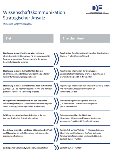 Neben Medientrainings und Workshops hat sich das DIF auf Kommunikationskonzepte spezialisiert. Hier bekommen Hochschulen und Forschungseinrichtungen maßgeschneiderte Handlungsanleitungen an die Hand. In folgenden Schritten: